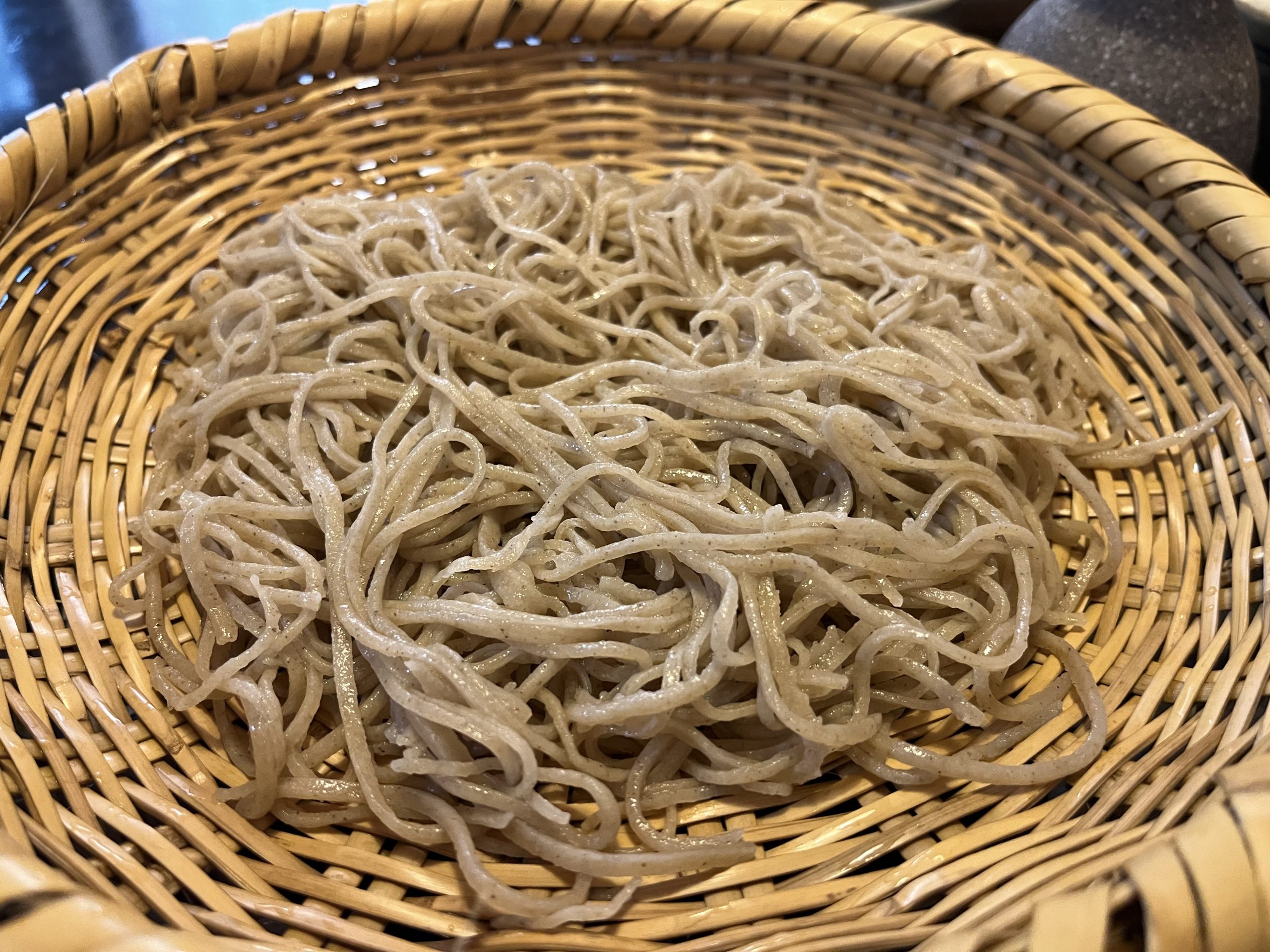 そばの実の外側にある甘皮を一緒に挽いたそば粉を使うため、色は緑がかっていてそばの風味も強く感じる。コシ、歯切れ、香りのバランスが揃っている麺。